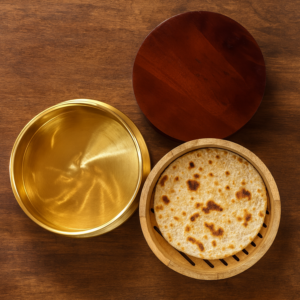 Bring a touch of elegance and tradition to your dining table with this Premium Brass & Wooden Chapati Box. Handcrafted by skilled artisans, this roti box is made from high-quality brass with a sturdy wooden lid, combining durability with a stylish look. The brass body helps in keeping your chapatis, rotis, or bread warm and fresh for longer, while the wooden lid ensures easy handling and adds a natural charm. Perfect for daily use as well as for serving guests, this chapati box is both functional and decorative. Its traditional design and premium finish make it an ideal choice for modern as well as classic kitchens. Along with storing rotis, it can also be used as a multi-purpose container for bread, parathas, or snacks.